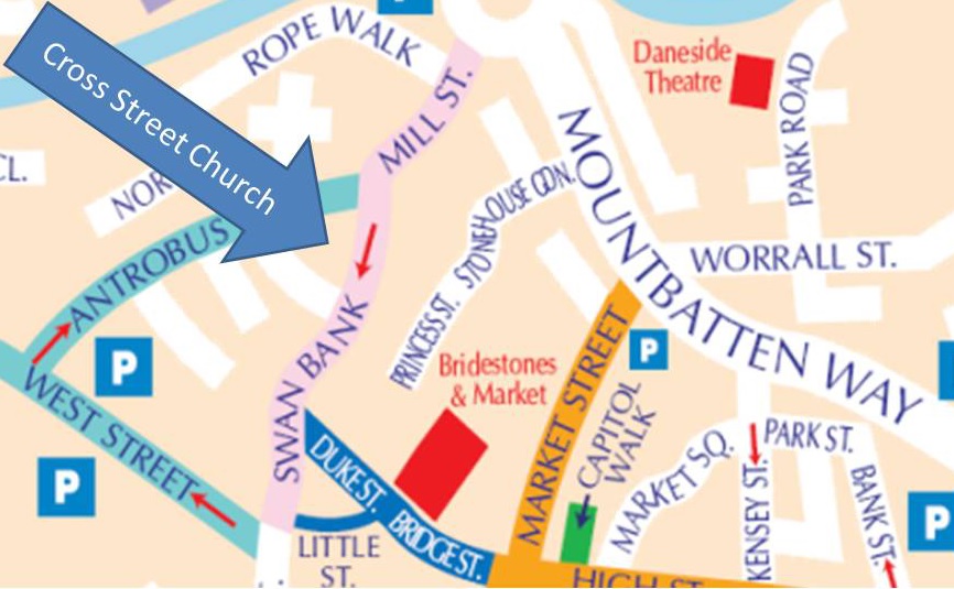 Cross Street Church is within walking distance of three public car parks: Princess Street car park is only 1 minute brisk walk (but it does involve climbing steps) up to Mill Street; Antrobus Street car park is a 2 minute brisk walk from the Church and West Street car park is a 3 minute brisk walk from the Church. The closest car parks are chargable from 8am to 10pm, Monday to Sunday. Free parking is available after 3pm at Back Park Street Car Park (a ten minute walk away).